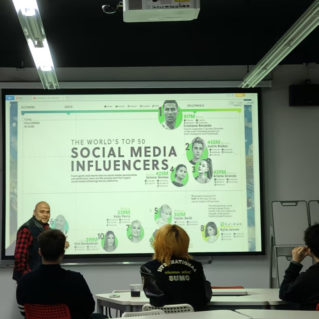 在分享环节中,David 介绍了具有全球影响力的网络视频创作者 Jimmy Donaldson,并通过其视频内容中的语言表达,分析互联网语境中产生的一些新兴表达方式,例如 “no cap”“brainrot”“hopecore”等。这些表达在网络视频传播和影视讨论中不断被引用,也逐渐进入年轻群体的日常交流。通过这些案例,同学们不仅学习到了真实语境中的英语表达,也进一步理解了影视传播与数字媒体环境对语言发展的影响。