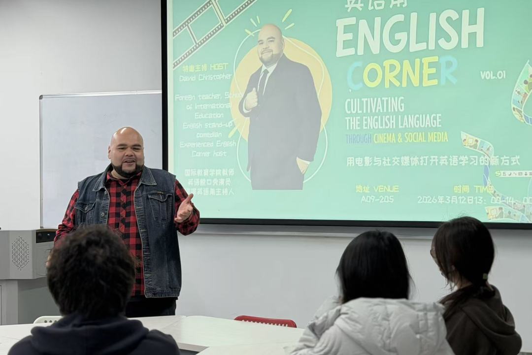 2026年3月12日,国际教育学院2025-2026春季学期第一期英语角活动 “Cultivating the English Language through Cinema & Social Media” 在轻松愉快的氛围中顺利开展。本次活动由国际教育学院外教David Christopher 主持,吸引了许多对英语学习和电影感兴趣的同学参与。