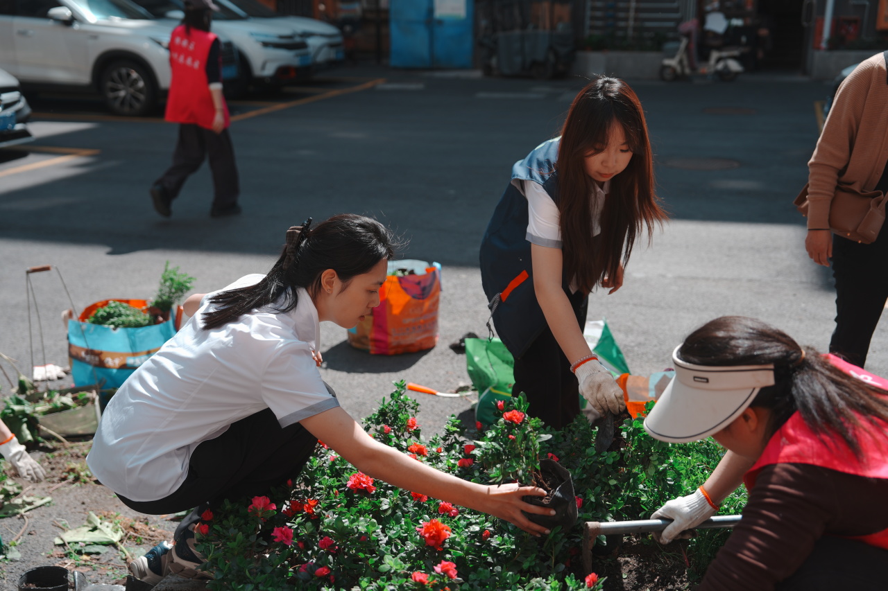 随后,志愿者们投入到小区环境“微更新”行动中。大家分工协作,对小区绿化区域开展割草和杂物清理工作,集中清除枯枝落叶与杂草,进一步提升环境整洁度;在花卉种植环节,志愿者们按照分工有序开展作业,有的负责翻松土壤、平整地面,有的进行花苗摆放与栽种,有的负责浇水养护与后期整理,新栽种的花卉错落有致,为社区增添了盎然生机与春日气息。