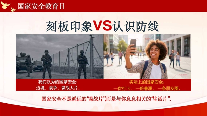 “现实中的国家安全,是你在社交媒体上晒出部队驻地的定位打卡,是被高薪诱惑收集实验室资料,是在网络跟风传播‘国家机密’谣言……”辅导员用一连串贴近校园生活的场景切入,“国家安全不是‘遥远的事’,而是藏在每一次点击、每一句分享、每一次选择里的‘身边事’。”