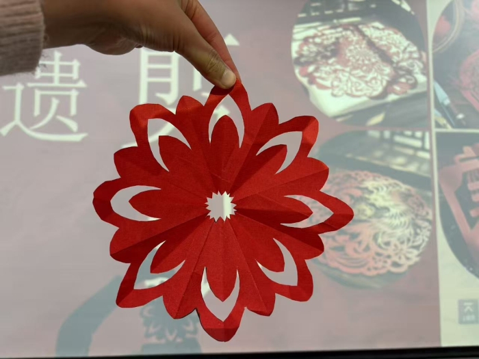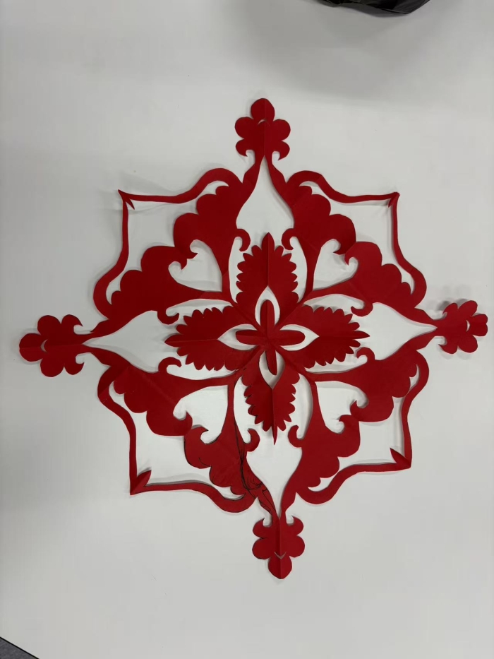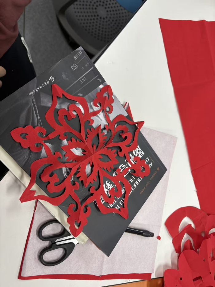 非遗不再停留在书本和屏幕上,而是化作手中实实在在的红纸与剪刀,成为可感、可触、可创作的文化实践。这是一次手艺的体验,更是一次文化自信的播种。在折纸、画样、剪刻的过程中,传统纹样被赋予当代青年的审美与思考,非遗在青春手中获得了新的生命力。同学们完成的不仅是一幅窗花,更是一份对中华优秀传统文化的理解与认同。